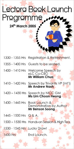 eLC has successfully launched the book You Can Create Web-based Contents in 2 Days Using Lectora on 24 March 2005 at the Grand Hyatt. More than 150 people turned up for the event, and they include corporate trainers, MINDEF instructors and commanders, MOE HQ officers, school/varsity HODs and eLearning officers.
